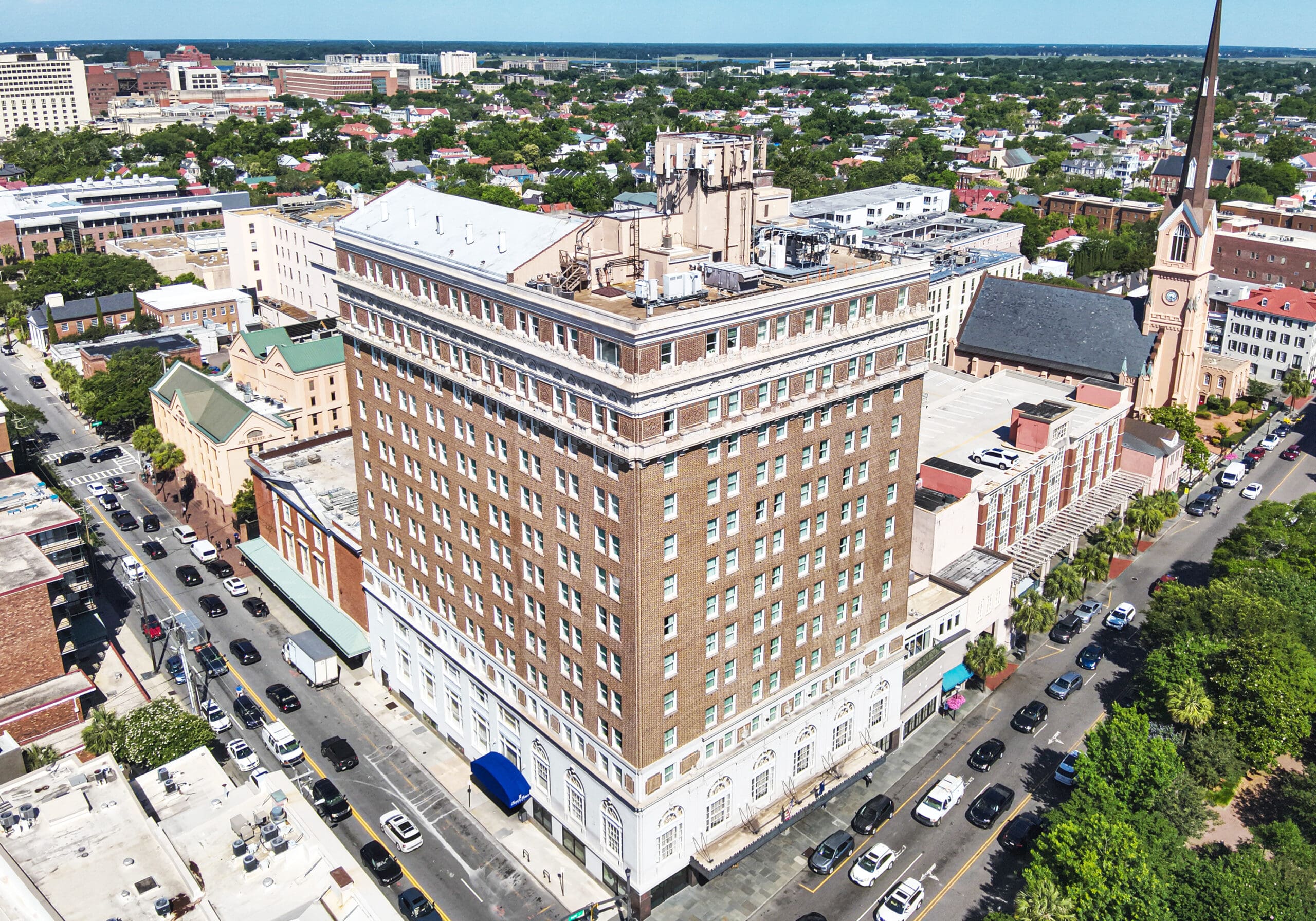 Built in 1924, Charleston’s Francis Marion Hotel is a twelve-story architectural landmark undergoing extensive restoration. Named after a Revolutionary War hero, the structure features cast-in-place concrete columns, poured concrete decks, and hollow terra-cotta blocks with brick filling. The building comprises two connected structures at King and Calhoun Streets, with the King Street side featuring commercial elements and a flat roof, while the Calhoun Street side has residential-style architecture with a gable roof.