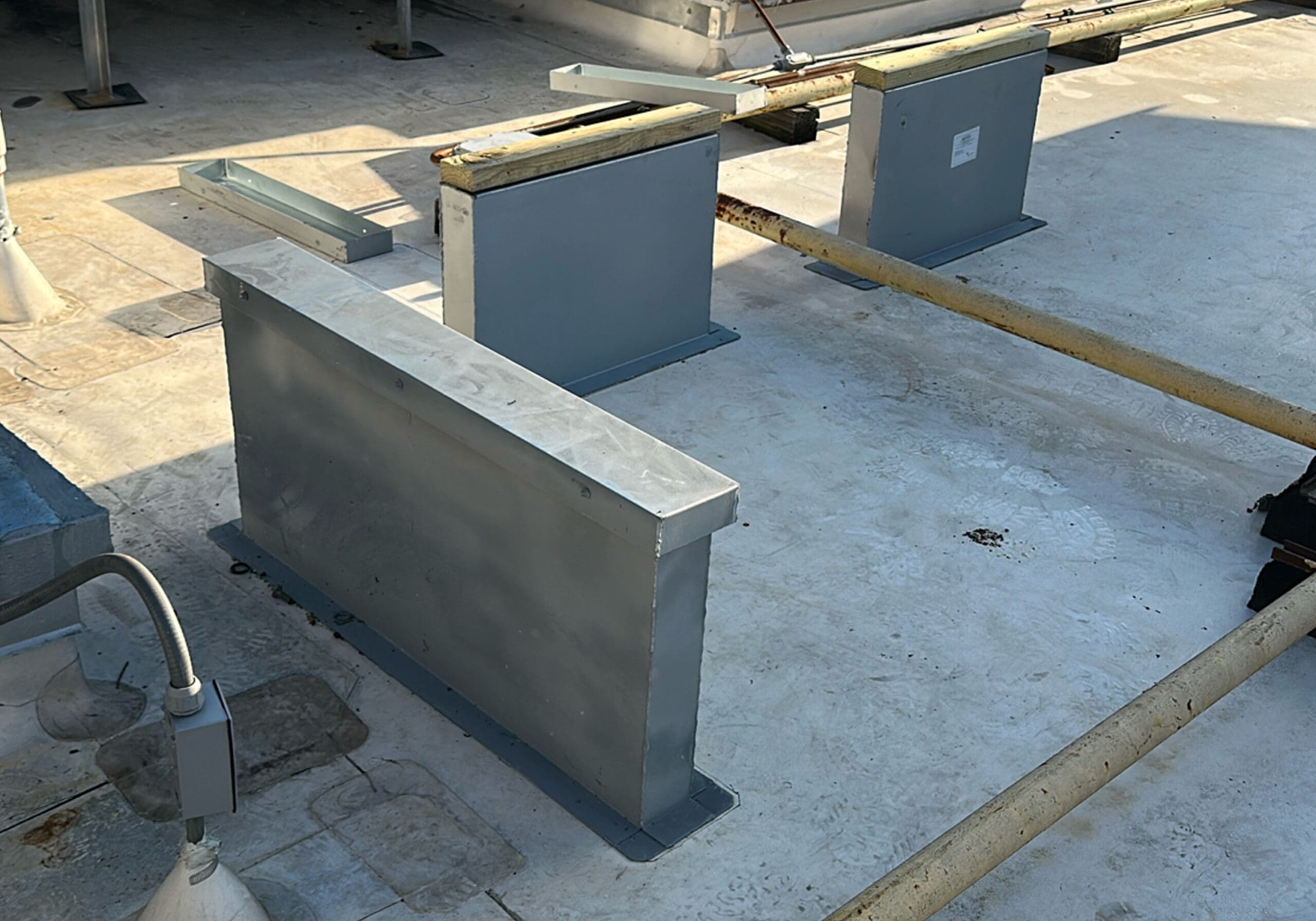 The WxTite Service crew installed the rail system for this project, which serves as mounting infrastructure for rooftop equipment and units. The roofing was removed down to the deck in each designated rail installation area. After the rails were installed, the roofing service division applied TPO membrane to tie into the existing membrane and created waterproof curbs around the newly installed rails, ensuring a watertight seal.